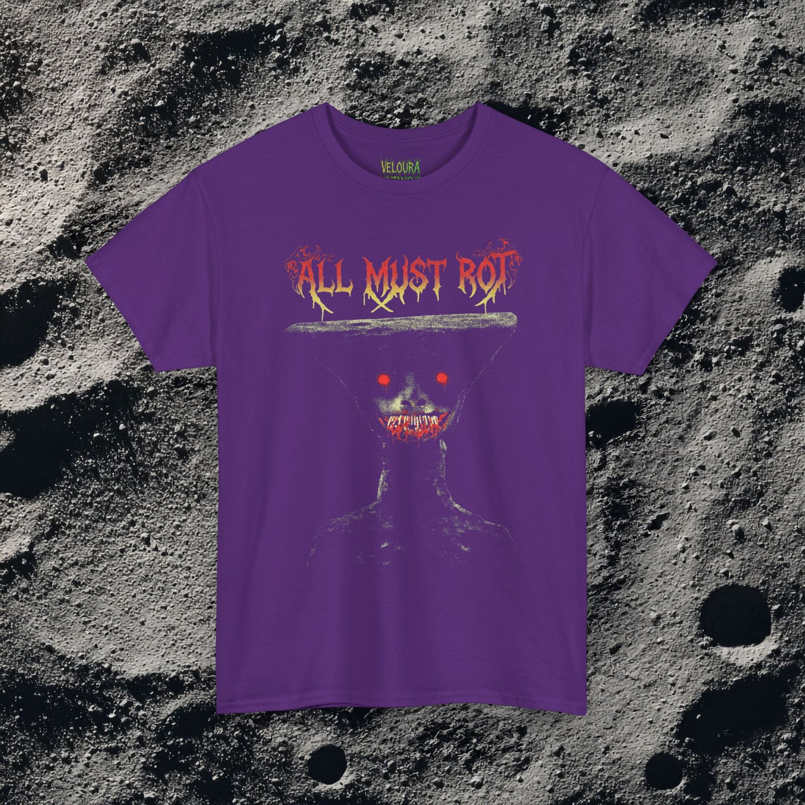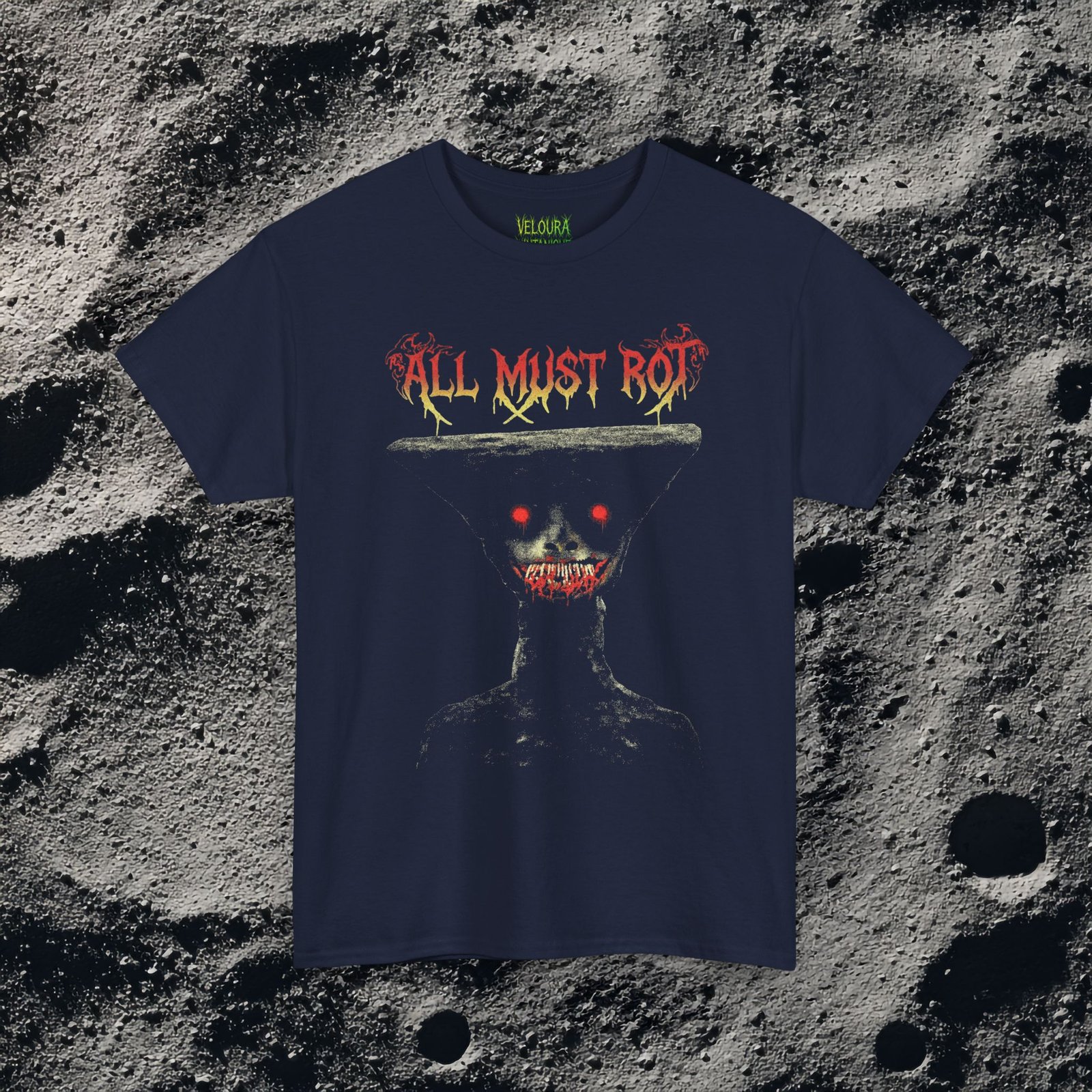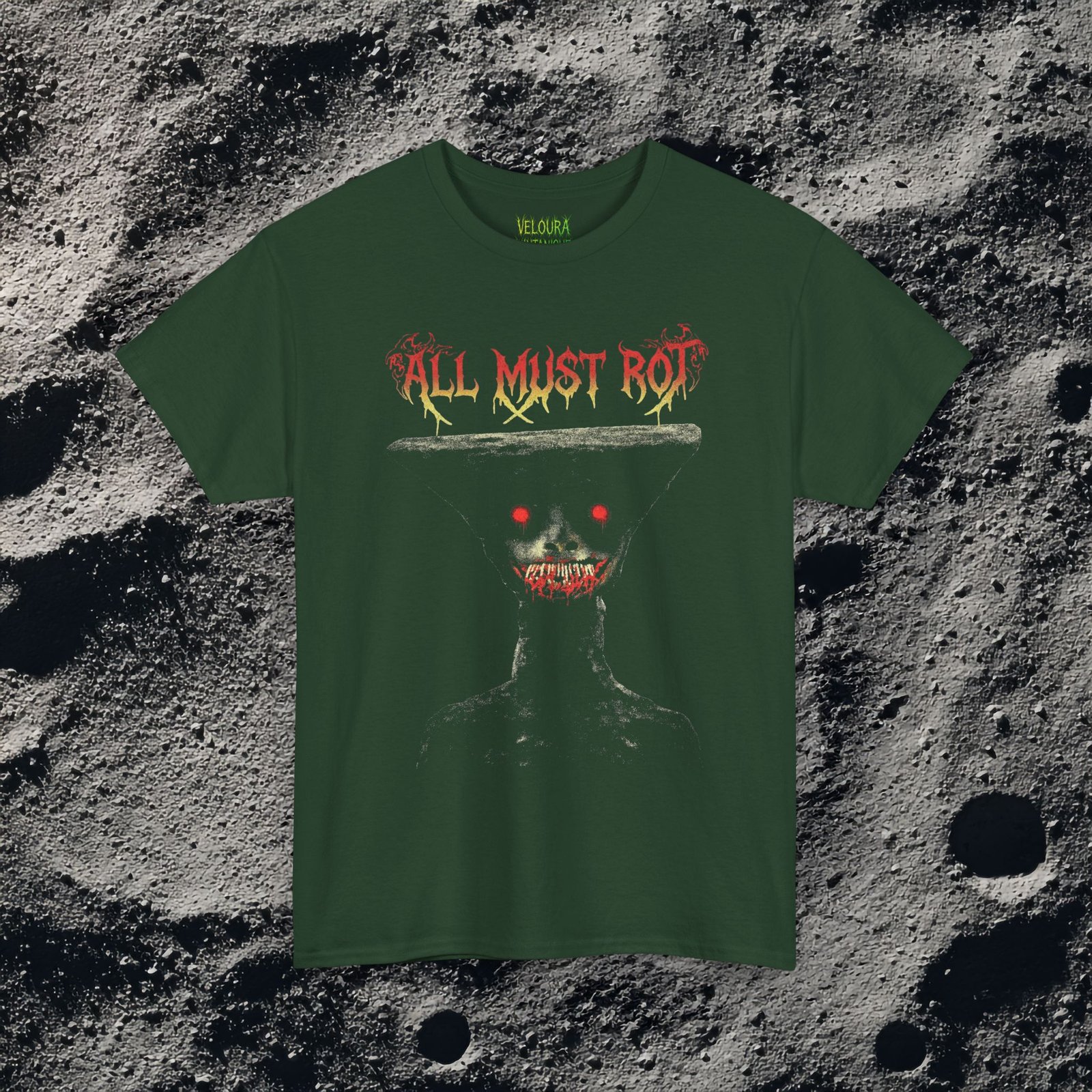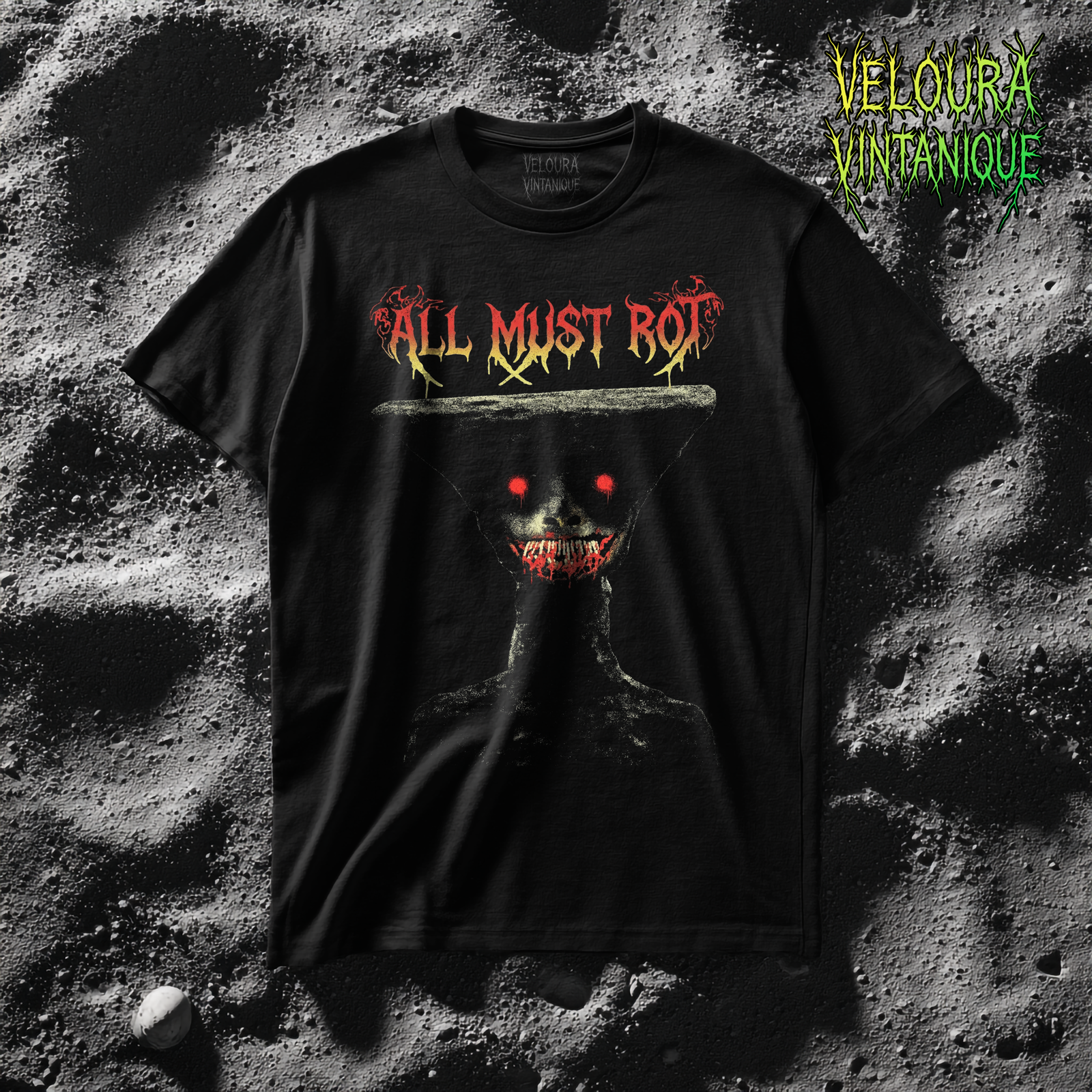 The “All Must Rot” horror shirt delivers pure nightmare fuel with its disturbing figure, glowing eyes, and decaying message. Inspired by analog horror, dark art, and gothic aesthetics, this design is made to stand out.