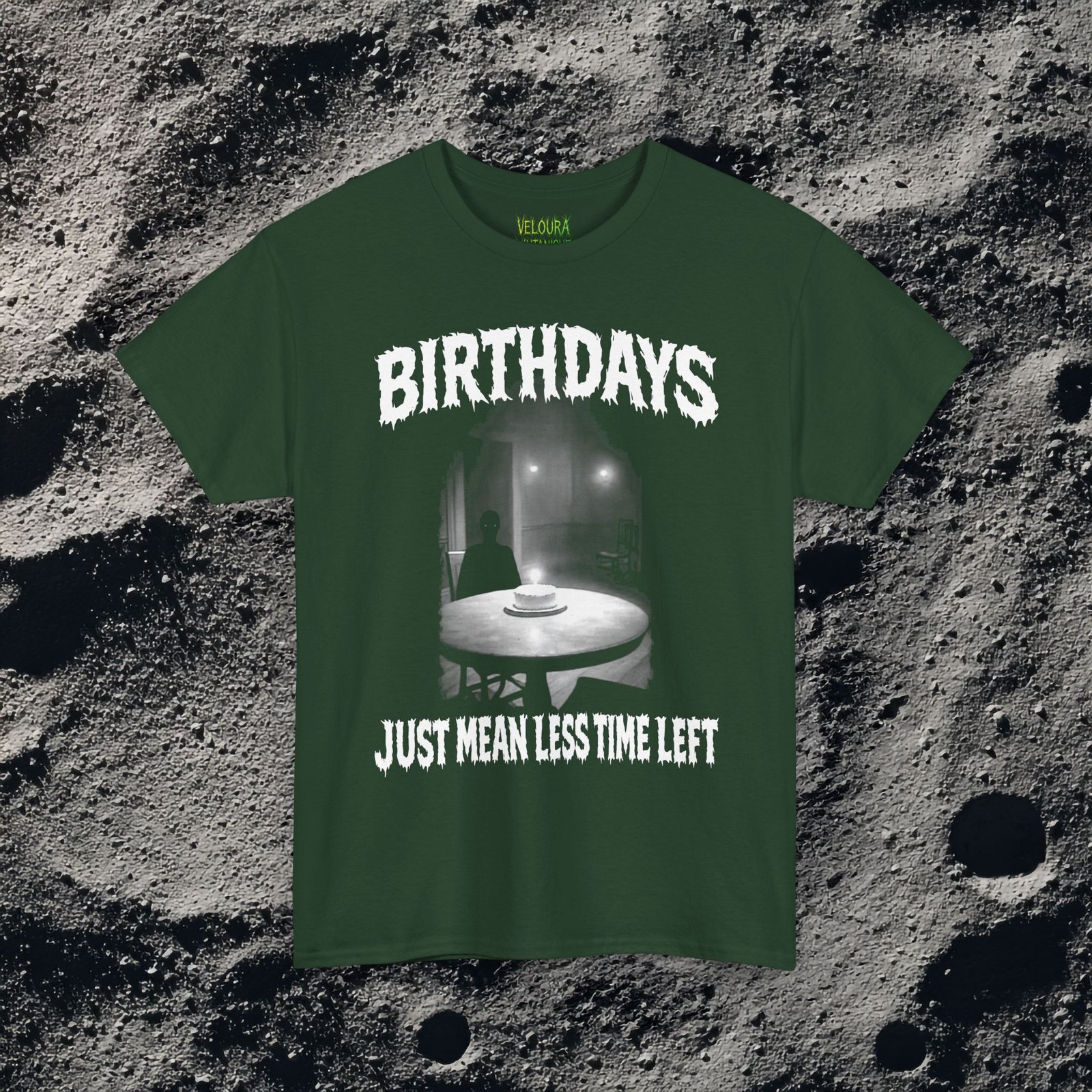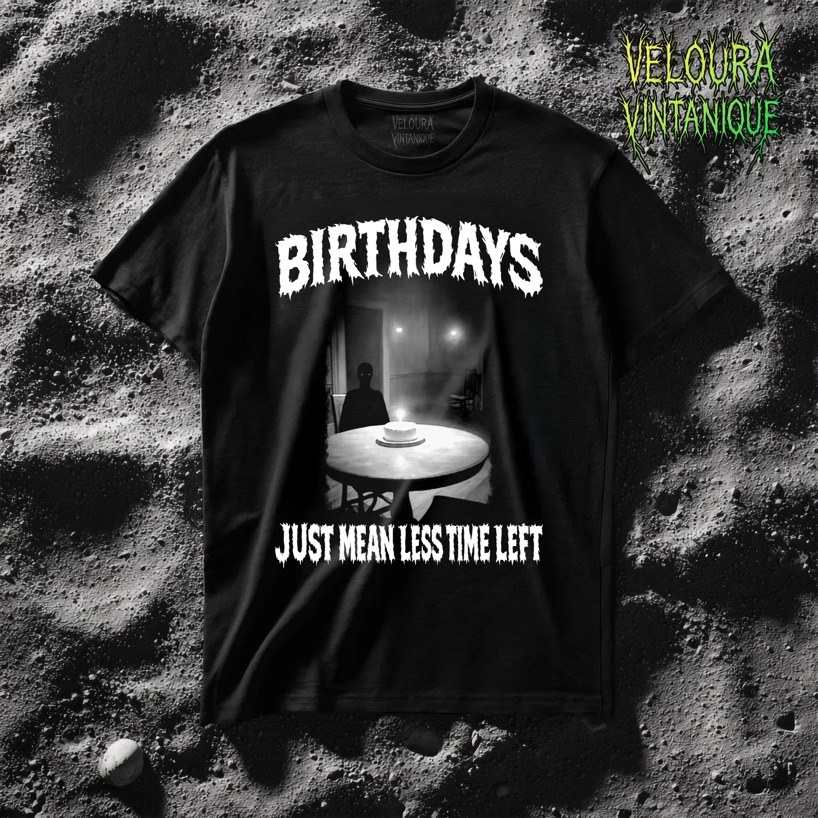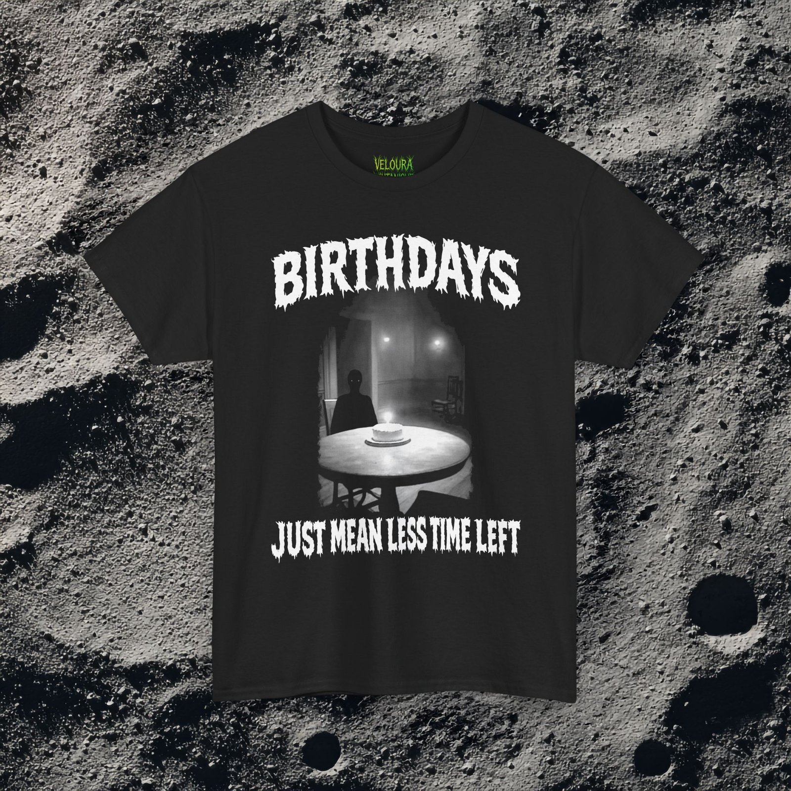 This creepy graphic tee shows a haunting birthday scene with a shadowy figure and a lone candle glowing in the dark.