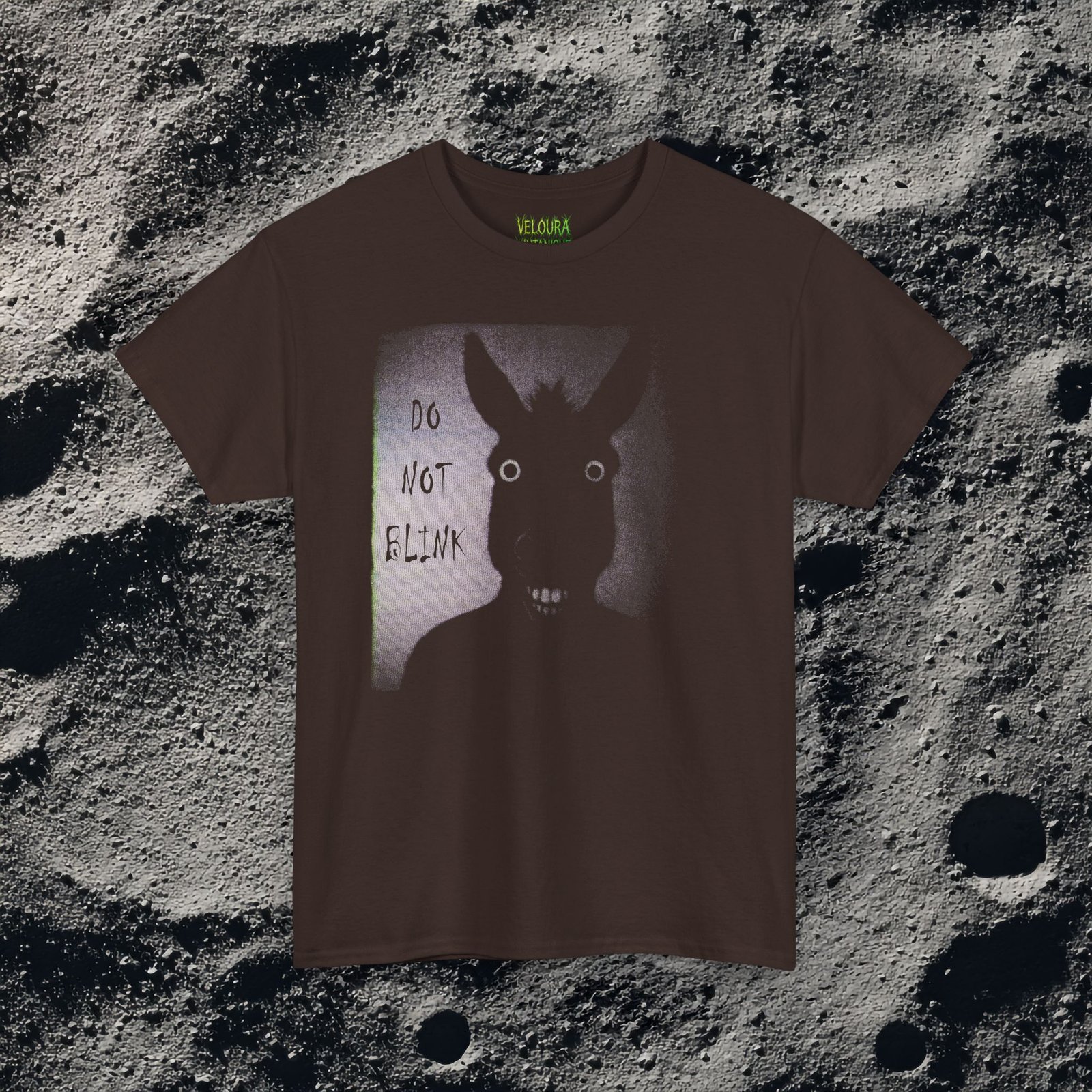 Analog horror shirt featuring a creepy donkey design. Don’t you dare to blink. Something horrible might happen.