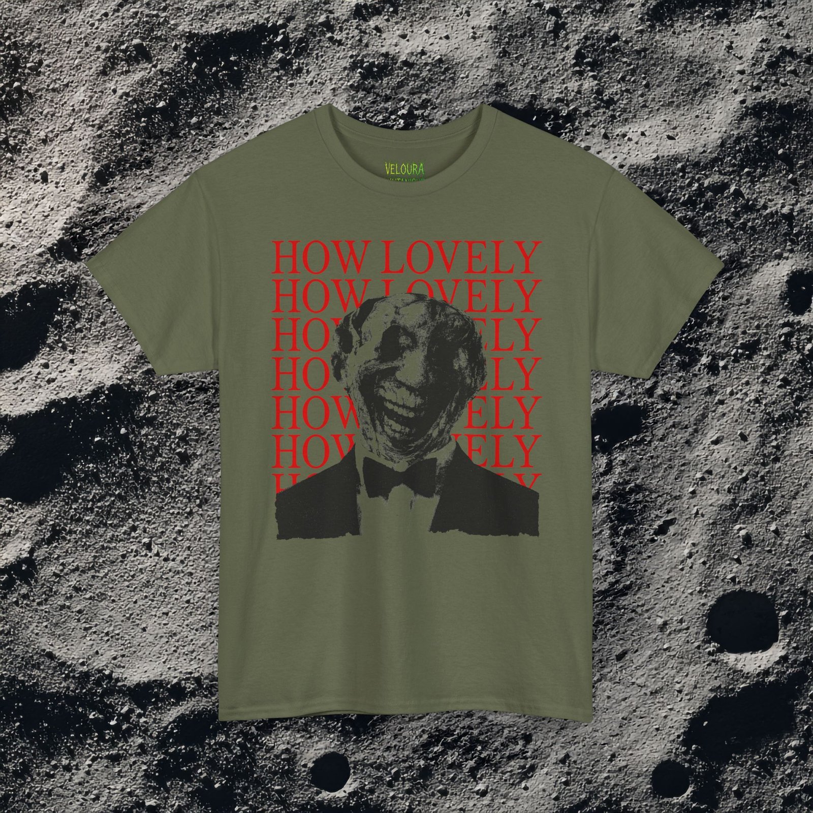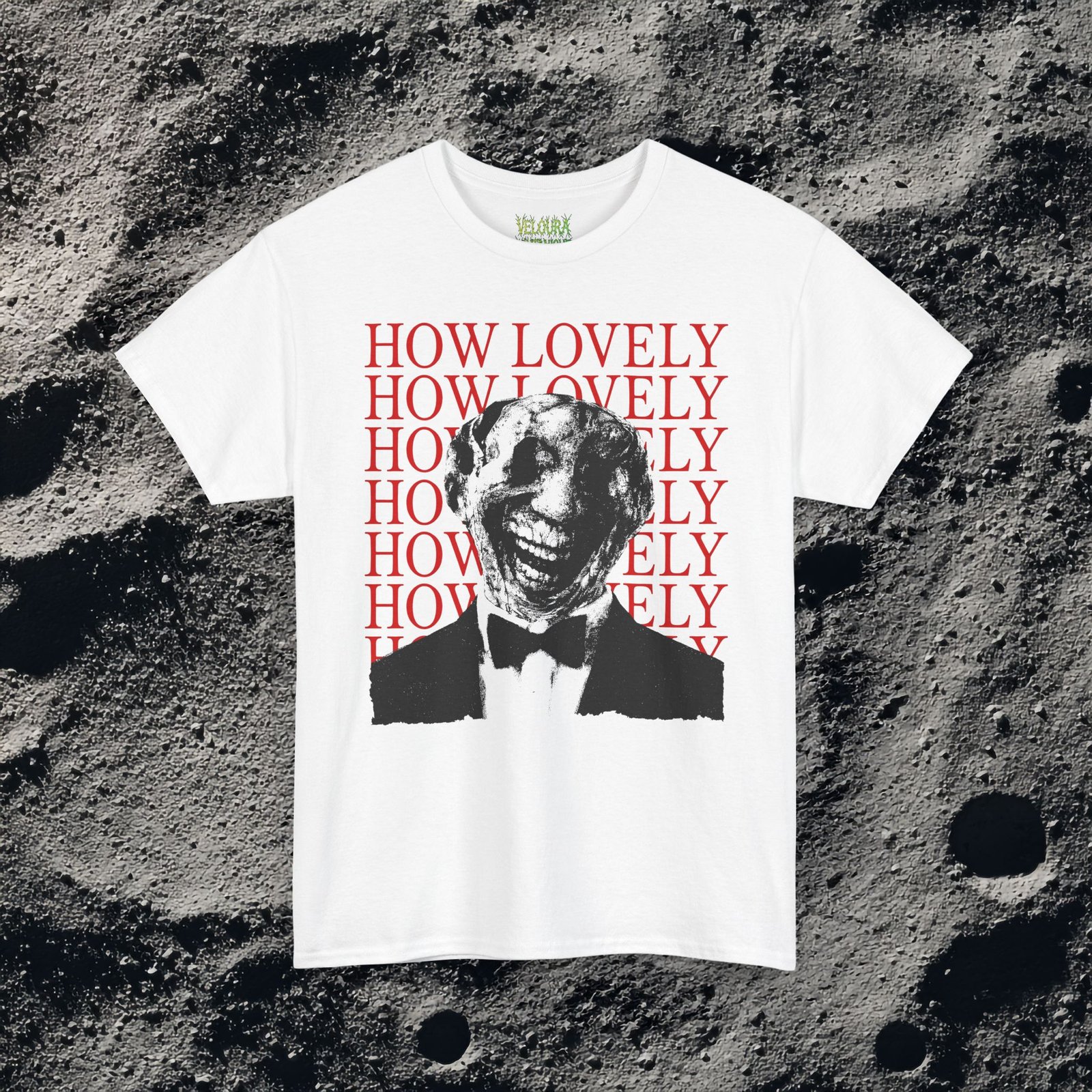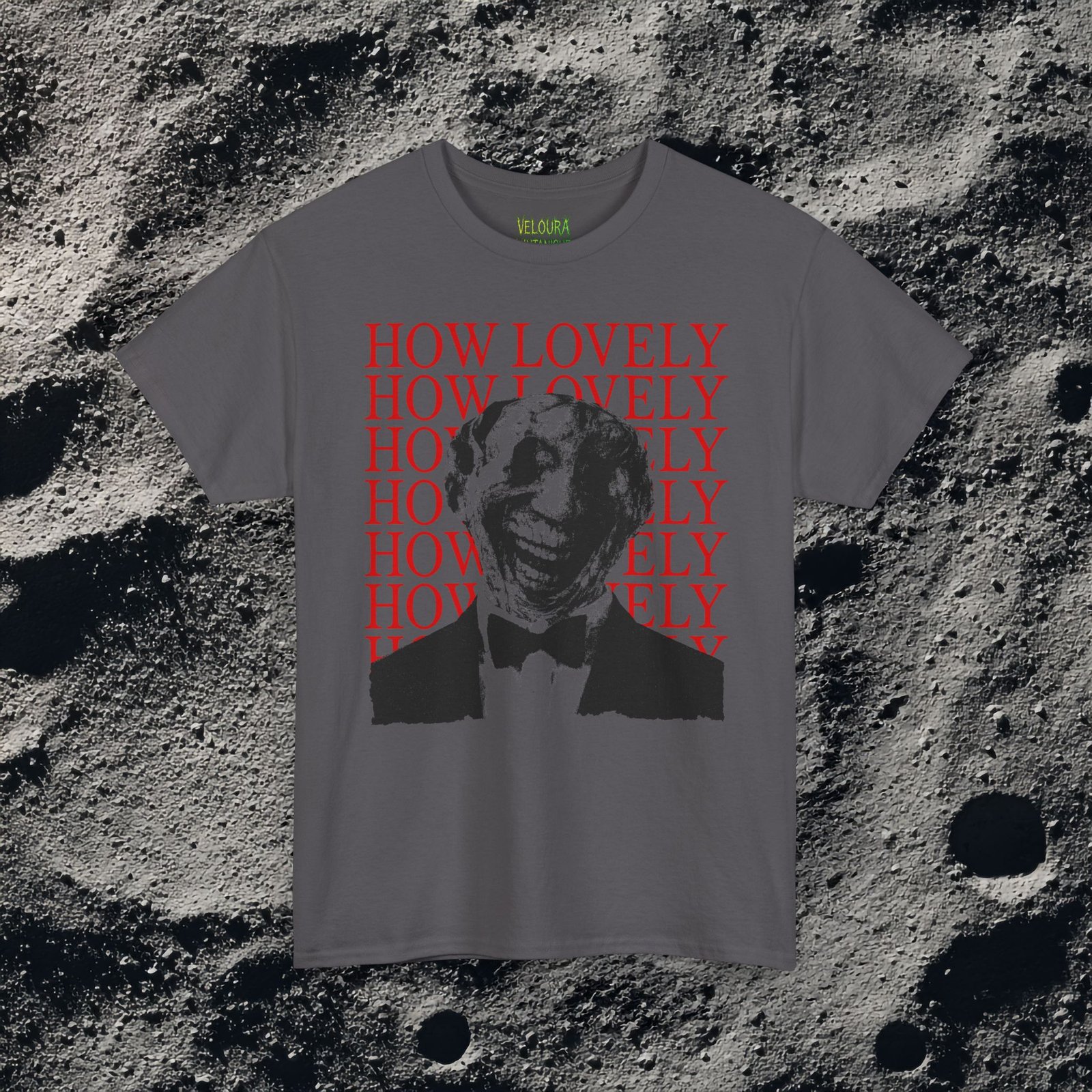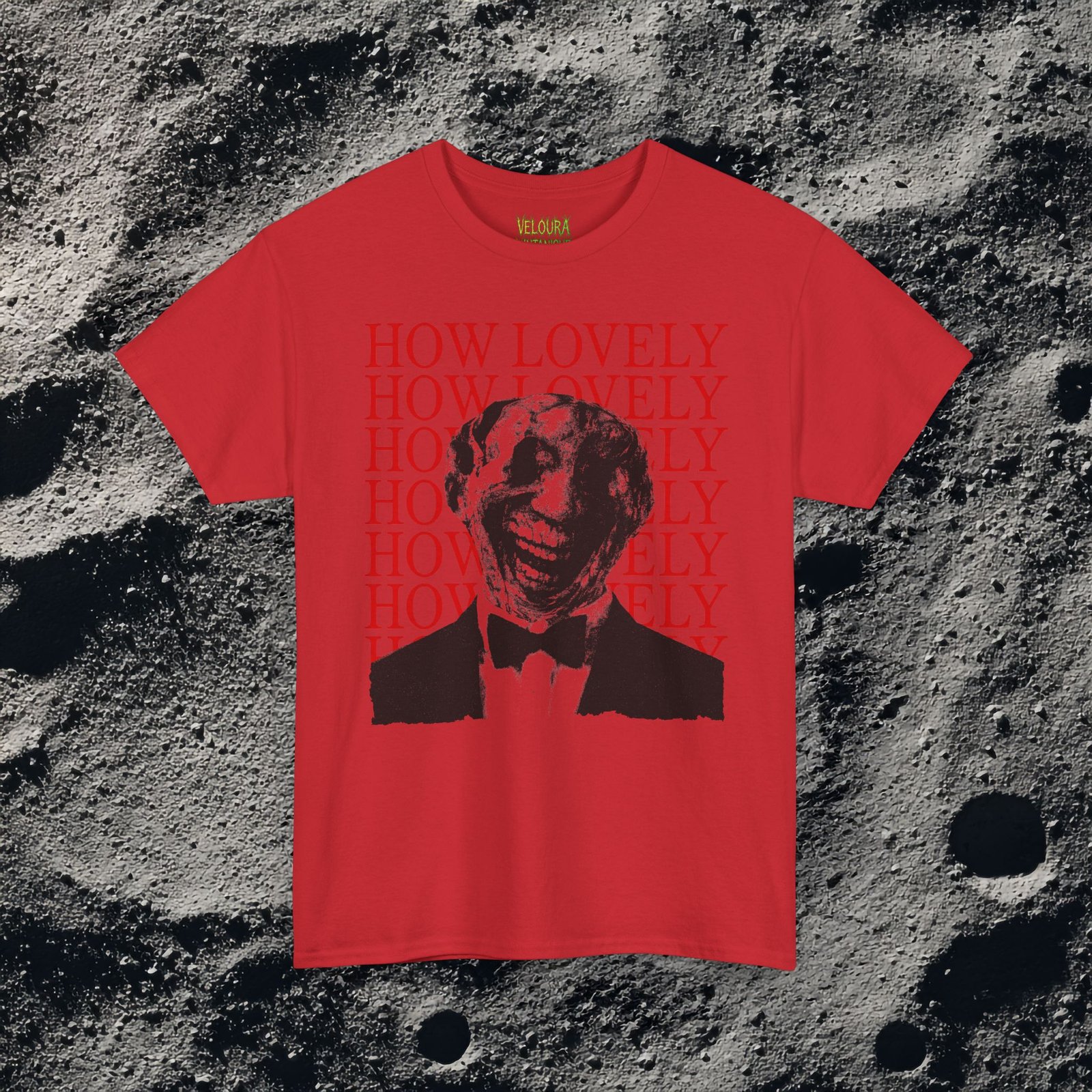This dark surreal horror tee features a distorted smiling figure layered over repeating bold red typography for maximum unsettling impact.