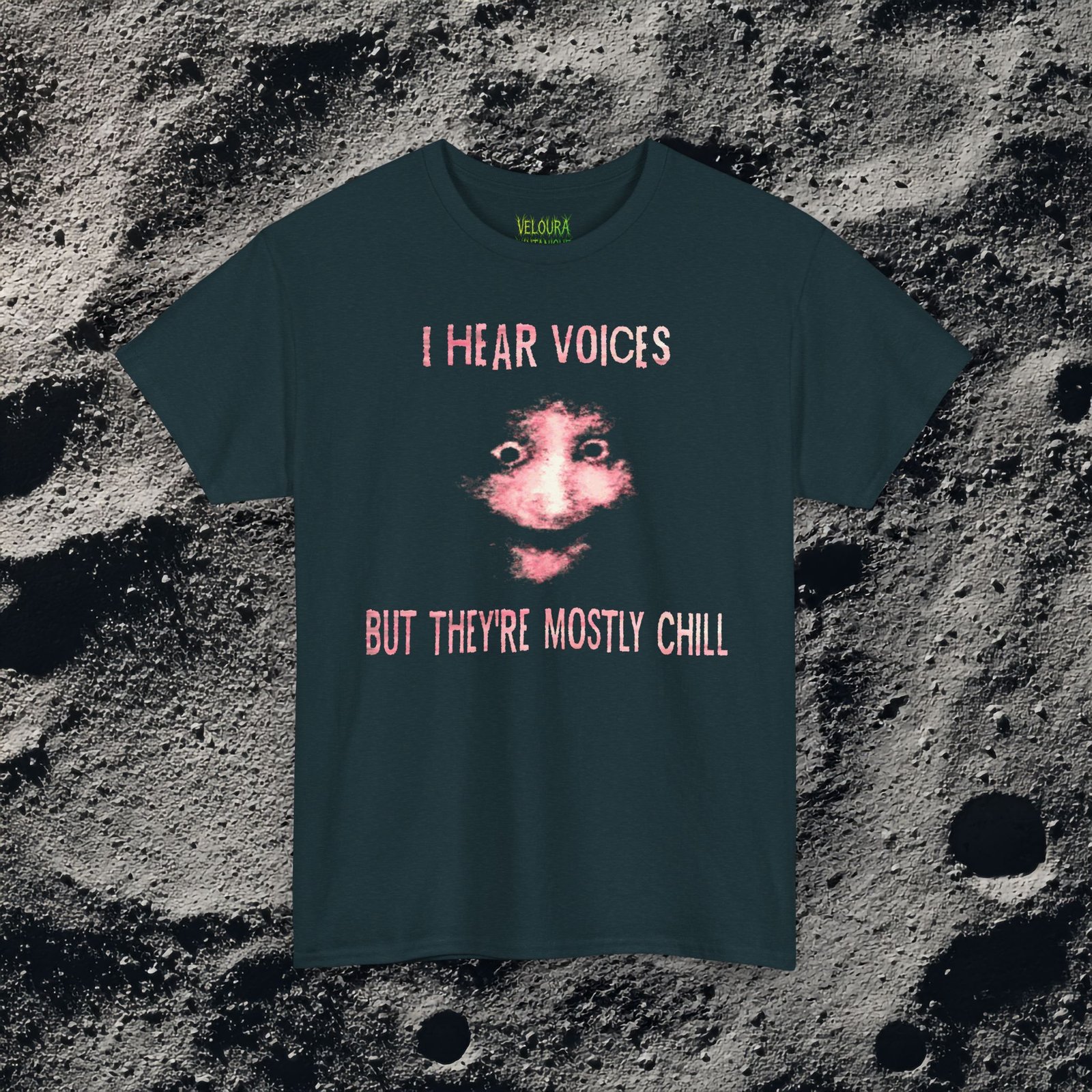 The shirt features a distorted, pink-tinted analog-horror face emerging from a black background, with grainy texture and soft, smeared edges that make the creature’s wide eyes and subtle smile appear both unsettling and strangely calm; above the face, the text “I HEAR VOICES” is printed in a rough, distressed pink font, and the same font appears below the face with the phrase “BUT THEY’RE MOSTLY CHILL,” creating a darkly humorous contrast between the eerie imagery and the casual, meme-like message.I Hear Voices but They’re Mostly Chill Analog Horror Schizo Meme Face