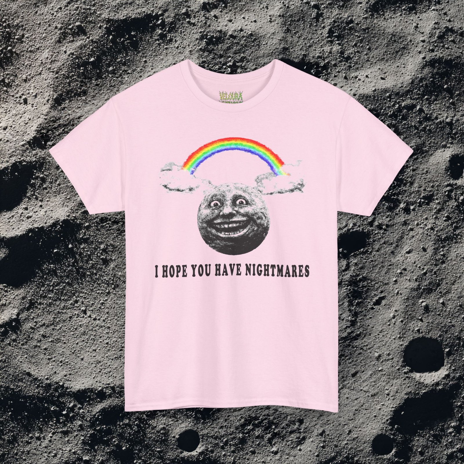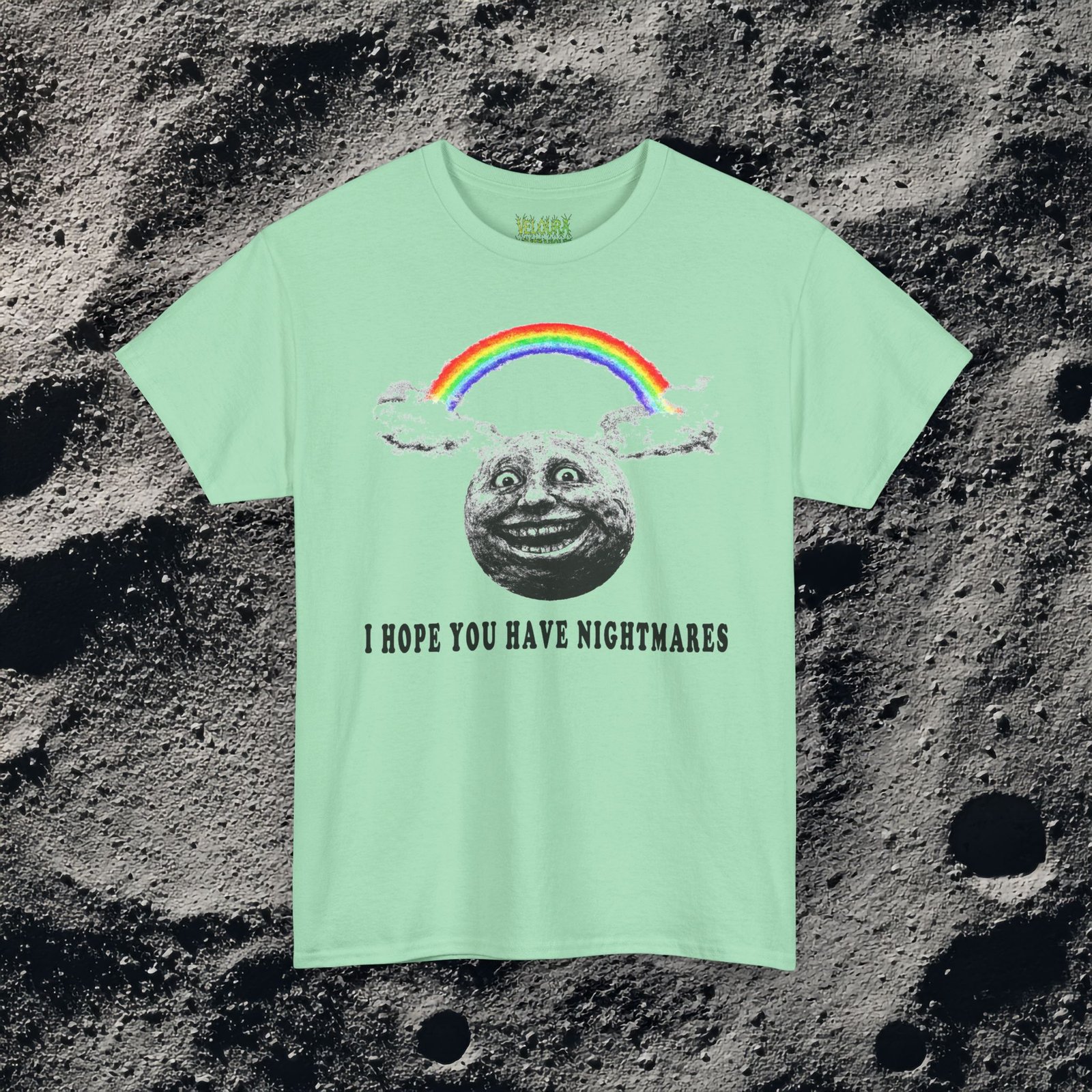 Sweet rainbow. Sinister smile. This shirt mixes wholesome visuals with nightmare fuel for the ultimate ironic horror look.
