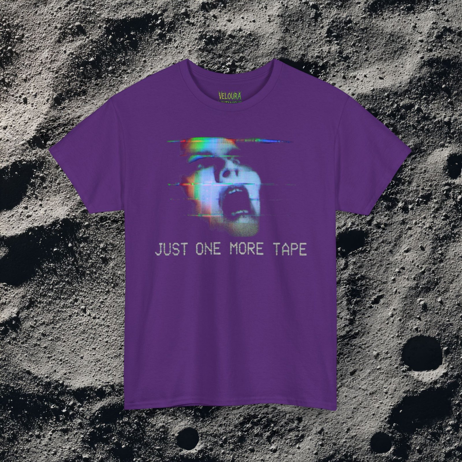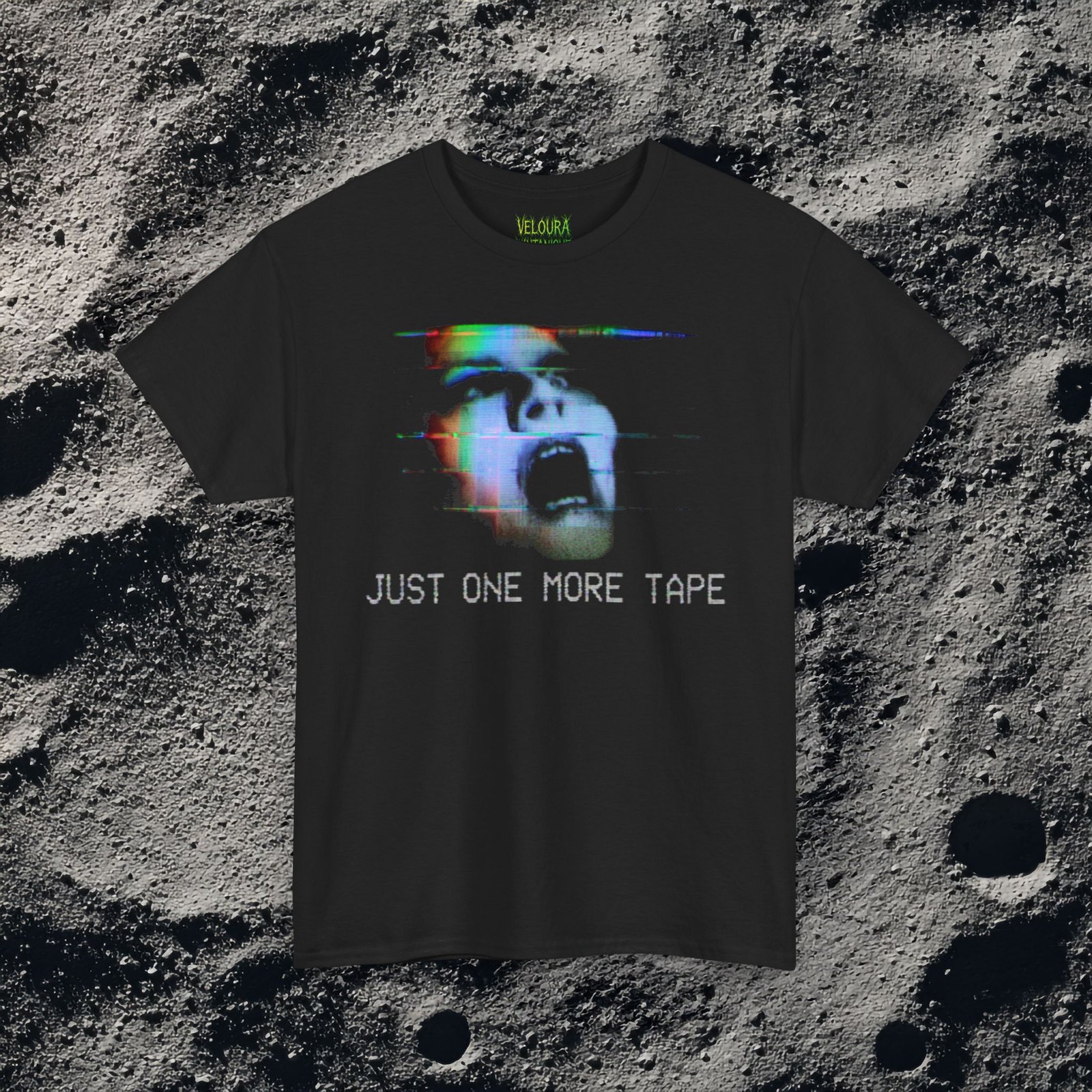 This T-shirt features a distorted screaming face rendered in a VHS glitch and analog static style, paired with the unsettling phrase “JUST ONE MORE TAPE.” The design draws heavy inspiration from analog horror, found footage, and corrupted videotape aesthetics. Color channel splits, visual noise, and scanline distortions create a haunting retro look that feels pulled straight from a damaged tape archive. Ideal for fans of creepy visuals, psychological horror, liminal media, and nostalgic VHS culture.Just One More Tape Analog Horror Face