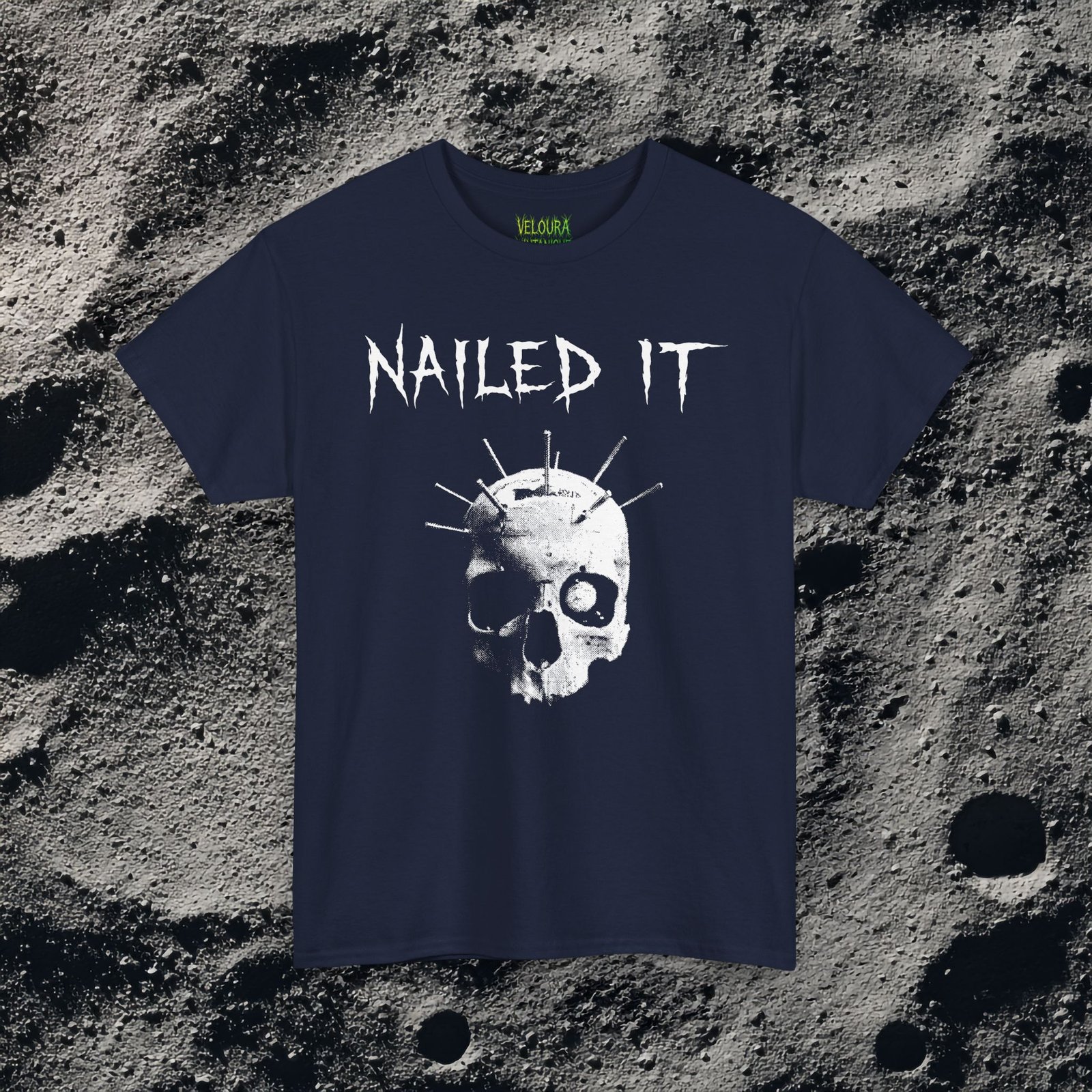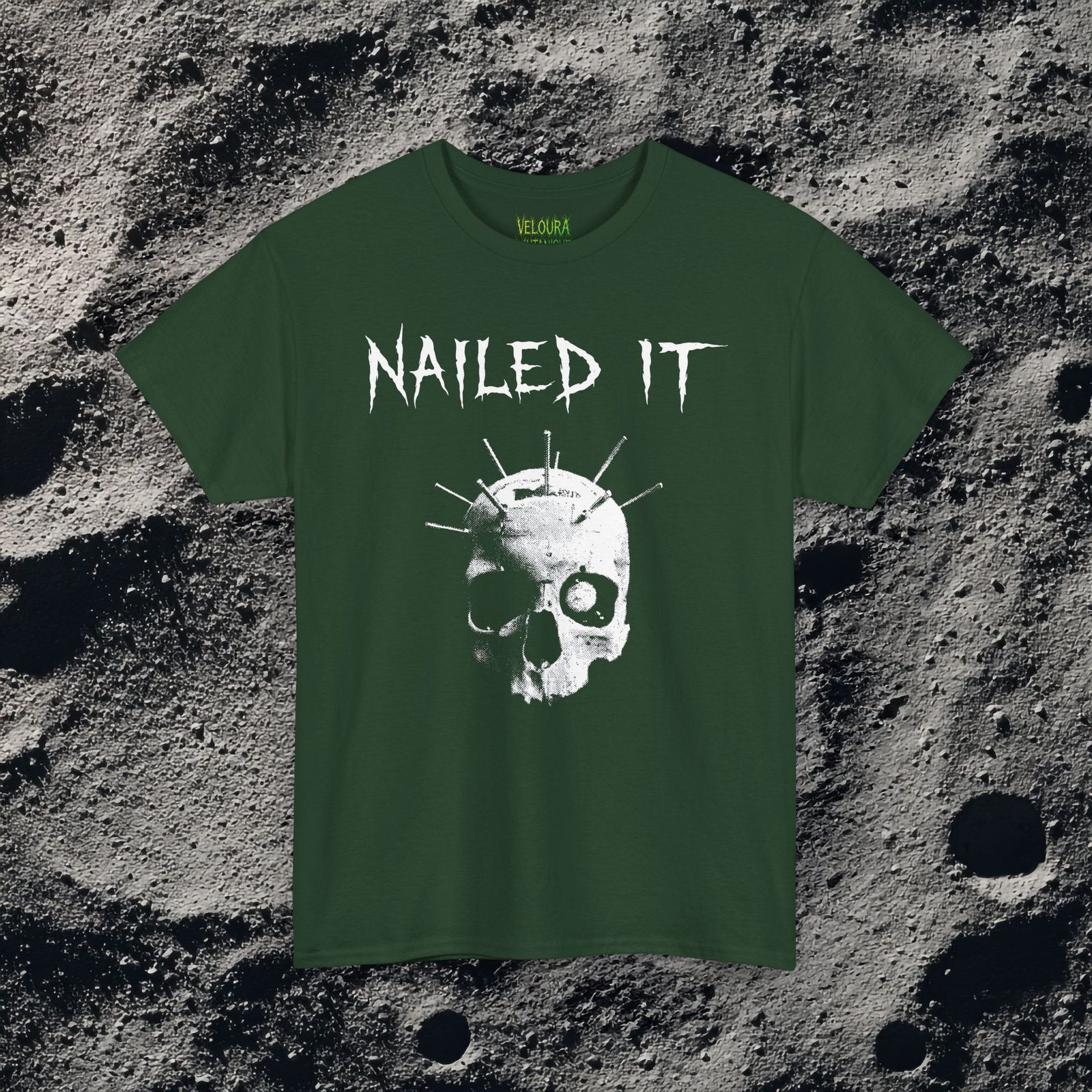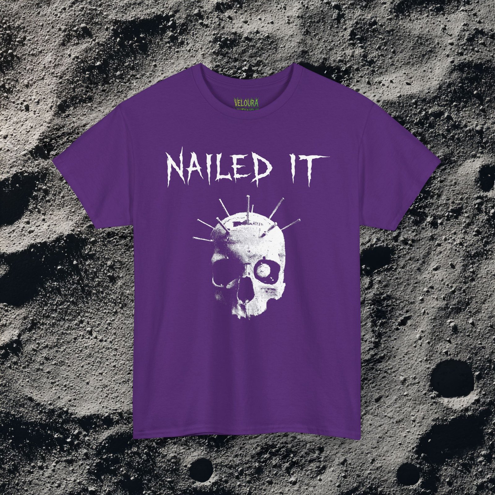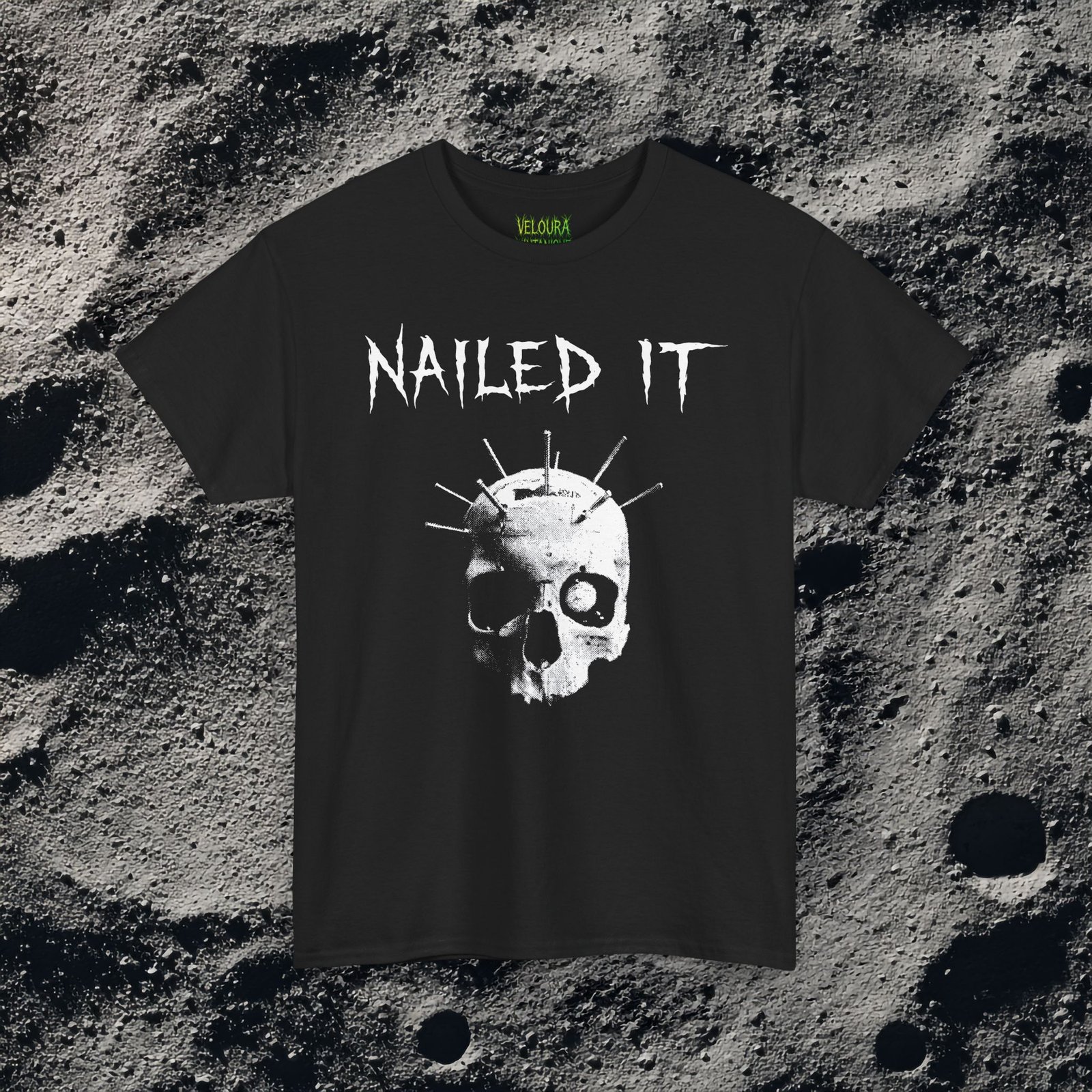 This gothic horror tee features a skull with nails driven through it, paired with the iconic phrase “Nailed It.”