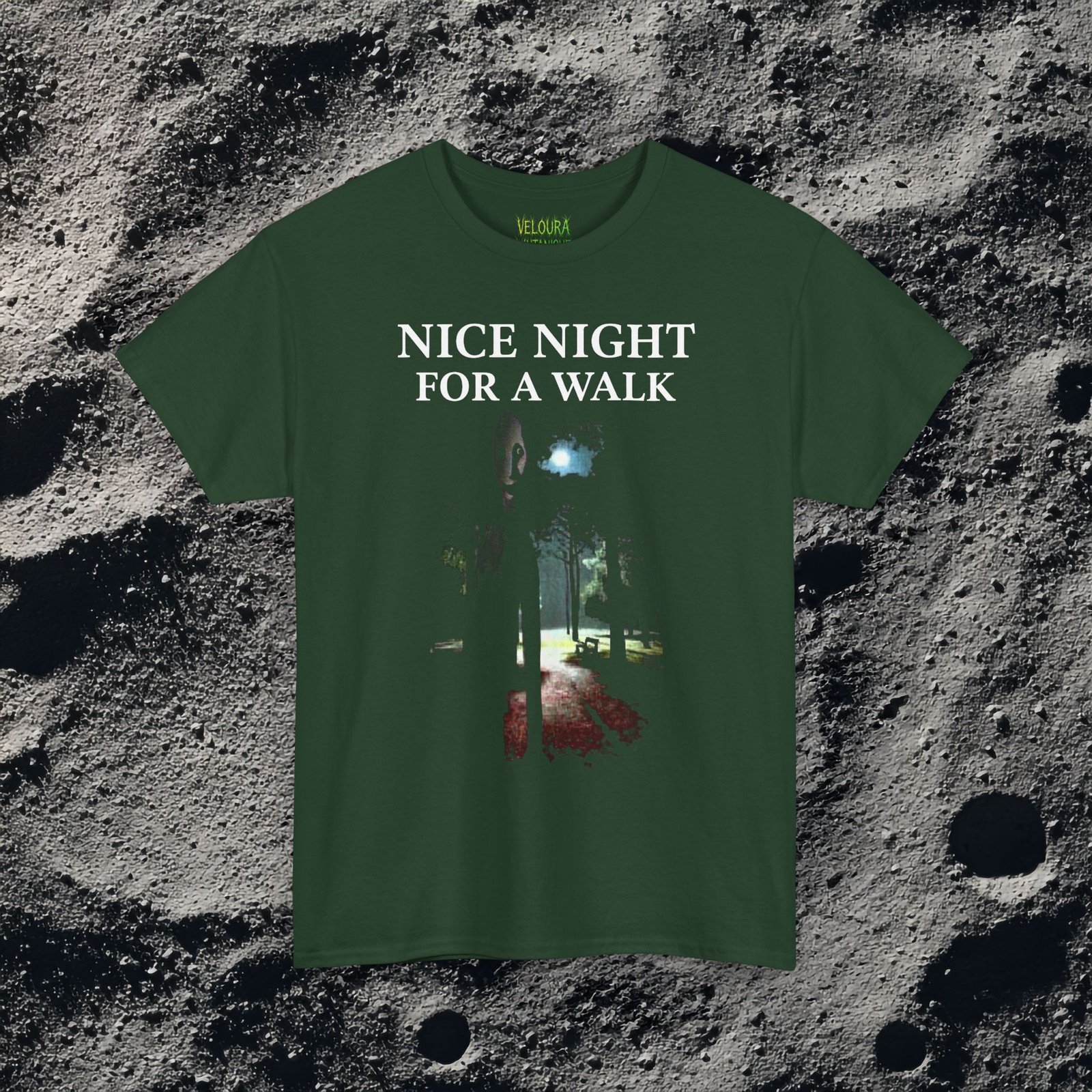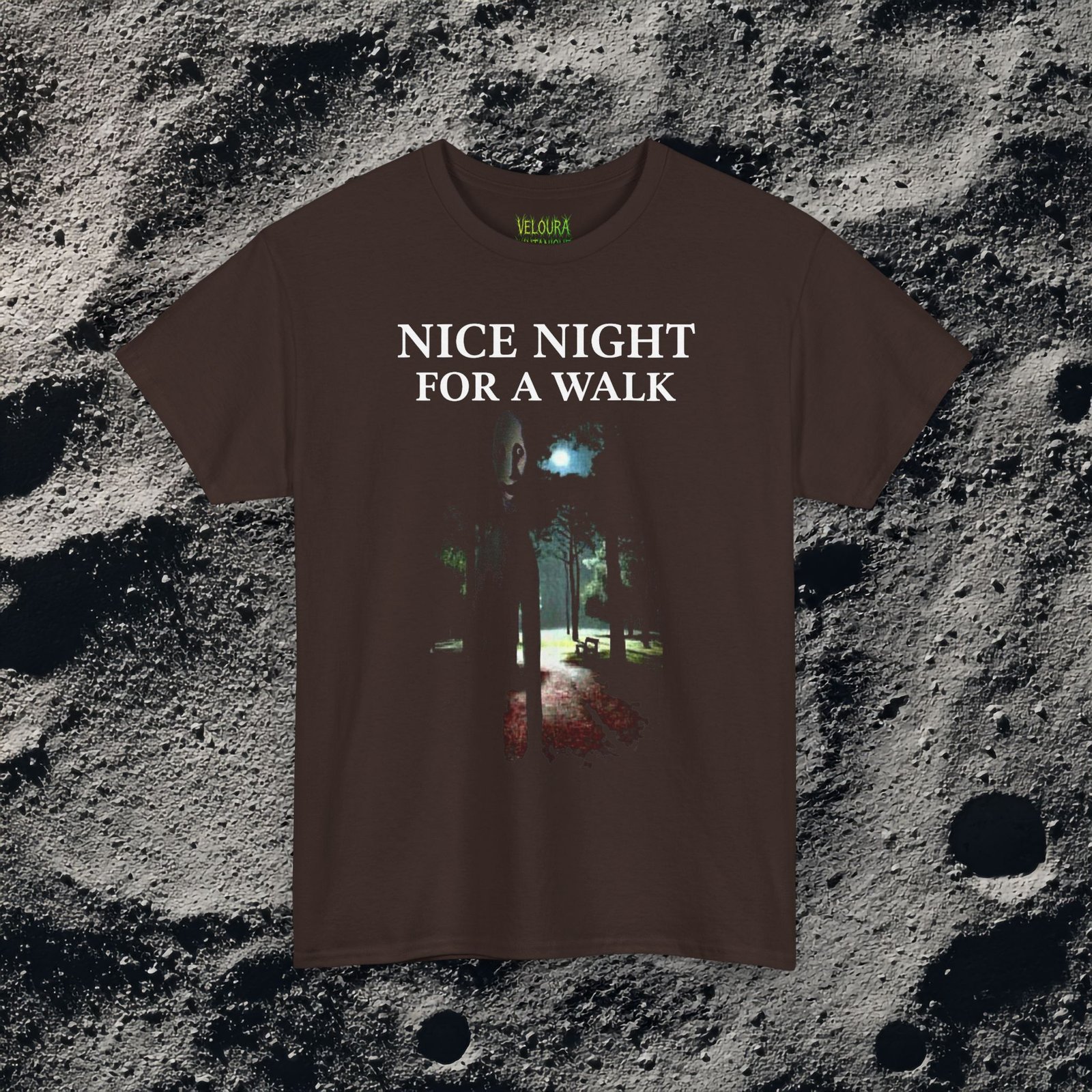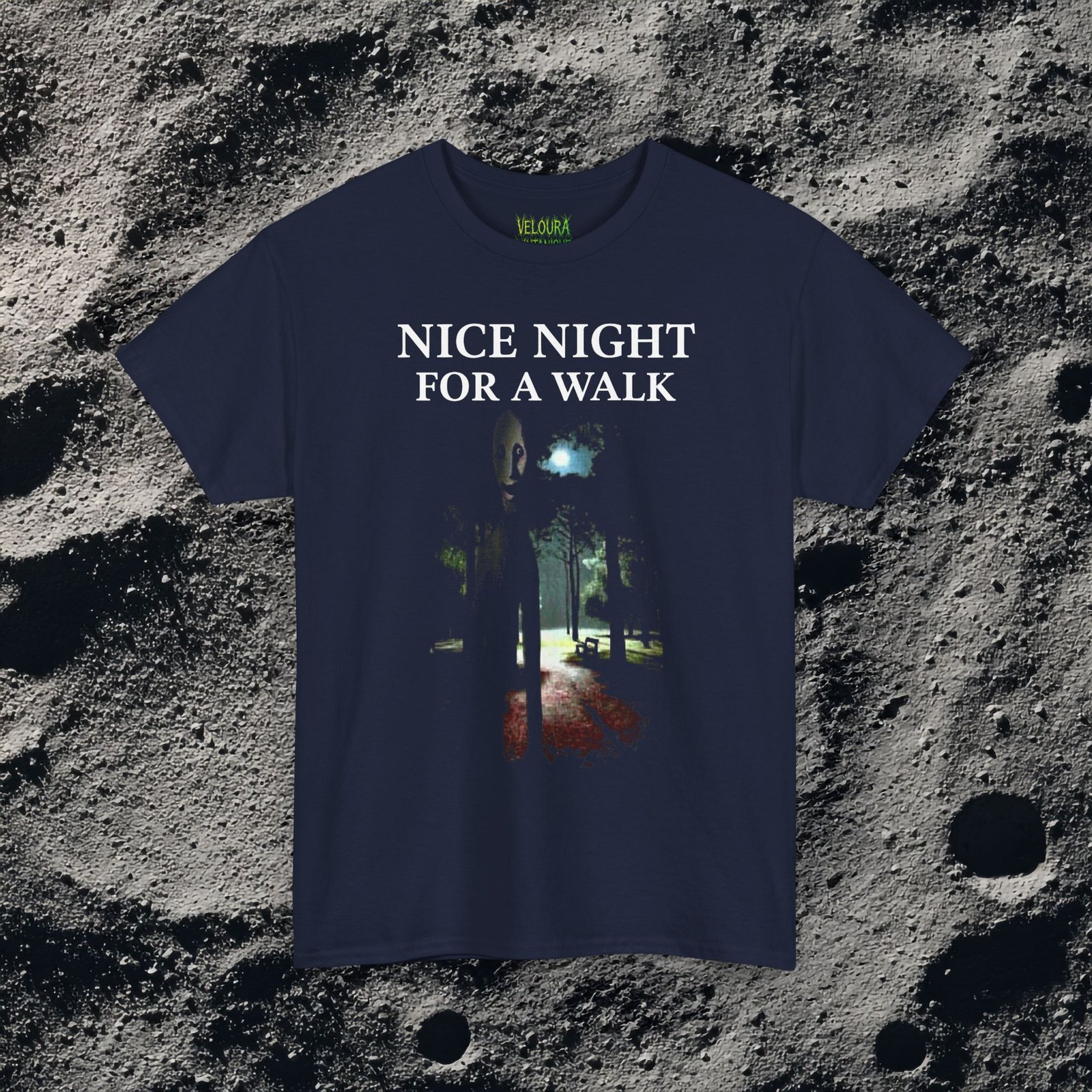 This creepy horror design shows a shadowy figure standing in a dark forest path at night.
