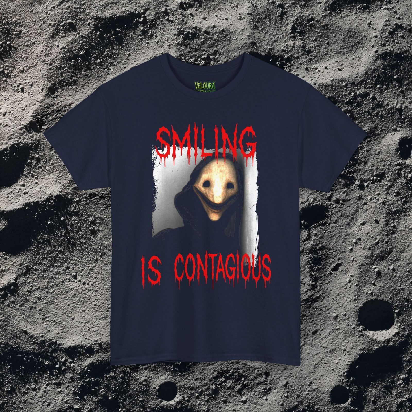 This horror t-shirt features a hooded figure with a pale mask-like face, hollow black eyes, and a wide unsettling grin, framed by the chilling phrase “SMILING IS CONTAGIOUS” in dripping blood-red letters above and below, creating a disturbing analog horror design with a creepy, nightmarish atmosphere.Smiling Is Contagious Creepy Analog Horror Face