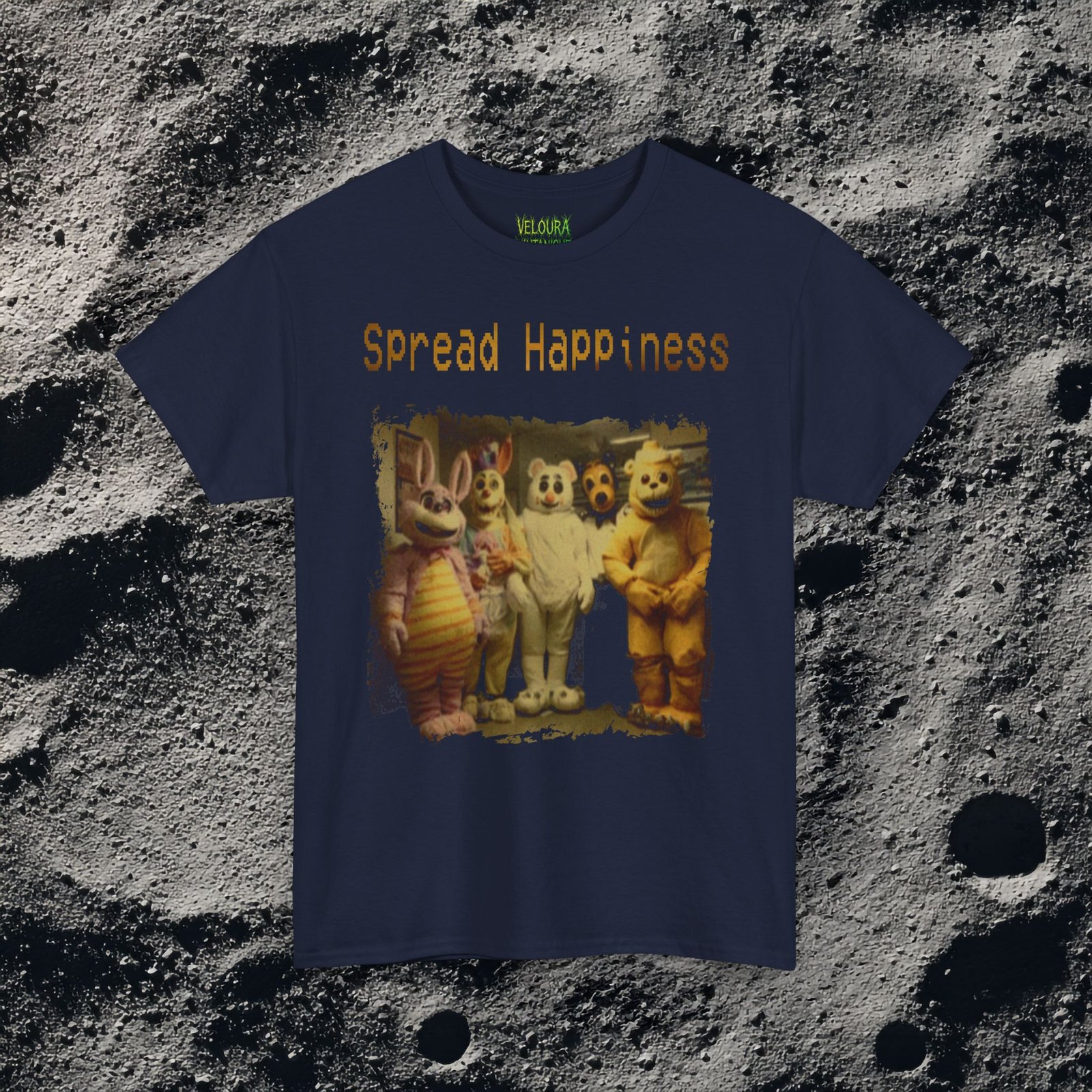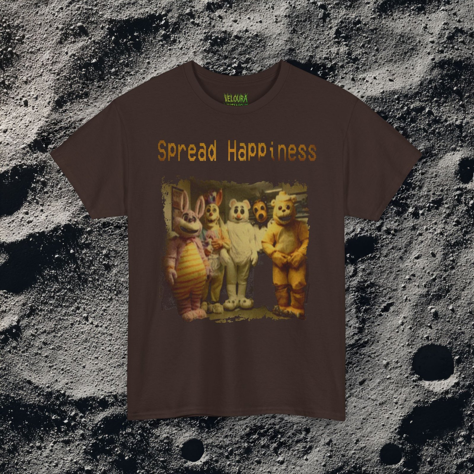 The shirt design features a distressed, vintage-style image of five unsettling mascot-like creatures standing side by side in a dimly lit room. Each character has exaggerated proportions, worn fur textures, and large, expressionless eyes, creating an eerie animatronic appearance. Above the group, the phrase ‘Spread Happiness’ is displayed in a pixel-style font, adding an ironic contrast to the unsettling atmosphere of the scene.Spread Happiness Spooky Analog Horror Mascot Group Photo